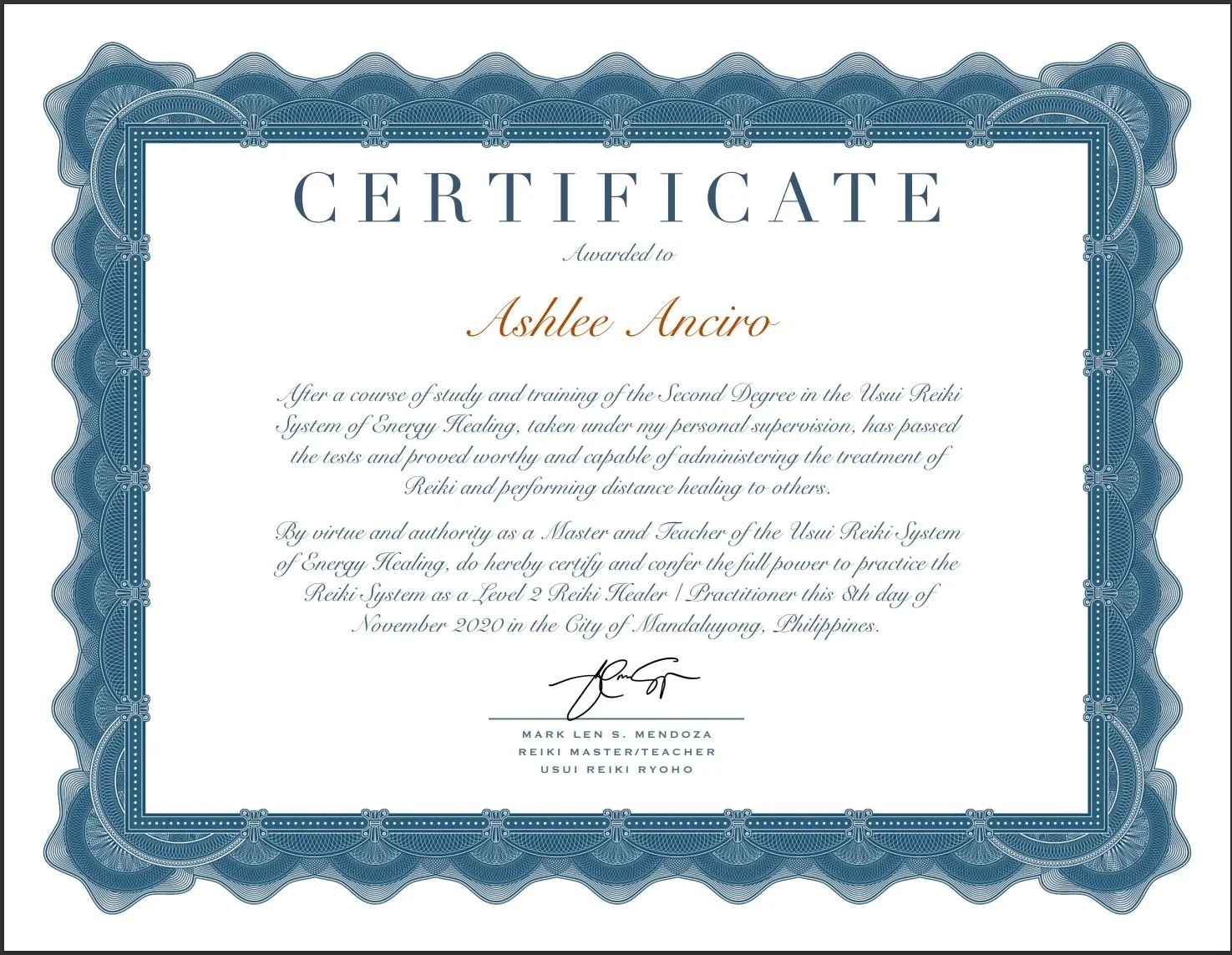 Most recently, Ashlee has obtained her Usui Reiki Level IIIa Master Certification with Usui Reiki Master Joyce Leonard in November of 2024. You can find her Usui Reiki Certificates here: